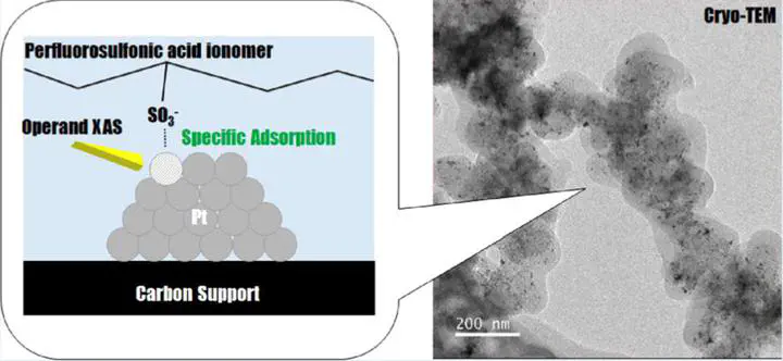 The influence of specific adsorption of the sulfo group in the perfluorosulfonic acid ionomer, Nafion, on the oxygen reduction reaction (ORR) of a carbon-supported Pt/C catalyst using a thin-film rotating disk electrode was investigated. The relationship between the catalyst activity and coating of the Pt/C catalyst with Nafion was quantitatively evaluated through electro chemical measurements, operando X-ray absorption spectroscopy (XAS), and CO stripping voltammetry. Activity of the Pt/C catalyst decreased with increasing ionomer-to-carbon weight ratios. To date, the effect of specific adsorption on a catalyst has been investigated using CO stripping voltammetry. However, quantitative evaluation of specific adsorption at the ORR potential (0.50−1.0 V) has not been performed yet. We quantitatively evaluated the specific adsorption during the ORR by measuring the 5d orbital vacancy of the Pt/C catalyst using operando XAS. The difference in the electronic structures of Pt in the high potential range, with and without the ionomer, was successfully established.