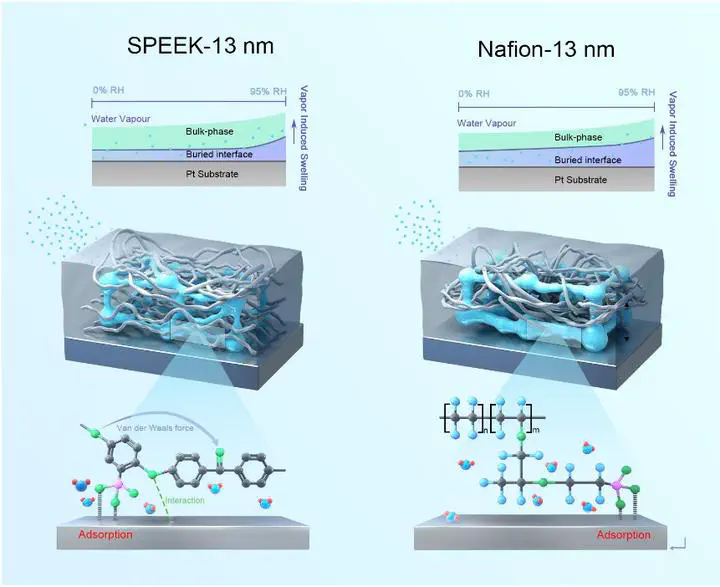 Image credit: UnsplashThe Ionomers critically impact catalysts layer performance in polymer electrolyte fuel cells (PEFCs). While sulfonated aromatic polyether-ketone (SPEEK) and Perfluorinated sulfonic acid-Nafion ionomers are widely used, their structure-property relationships under operating conditions remain insufficiently understood. In this study, we systematically analyzed Pt-supported SPEEK and Nafion films (13 nm) using in-situ ellipsometry, grazing incident wide-angle X-ray scattering investigate their morphology, water uptake, and proton transport properties. Compared to Nafion, the ultrathin SPEEK films exhibit dense, well-defined crystalline domains at the buried interface, attributed to a relatively stronger affinity for the Pt substrate. Analysis revealed that at 90%RH, the buried interface layer of SPEEK maintained a stable thickness of 13.8 angstrom, while Nafion exhibited a more pronounced swelling, increasing to 18.7 angstrom. Consequently, SPEEK thin films show reduced water uptake rates and conductivity, particularly under dry conditions. The proton conductivity measurements further highlighted a significant gap between in-plane and out-of-plane directions for SPEEK, with out-of-plane conductivity being 1-2 orders of magnitude lower, whereas Nafion displayed a smaller anisotropy. We propose that the intermolecular forces between ether groups, along with the interactions between Pt and oxygen atoms in the repeating units of SPEEK, contribute to the differences observed in the buried interface structure. This study enhances our understanding of ionomer-containing films in relation to molecular structures, confinement effects, and substrate interactions, thereby facilitating under fundamental investigations of catalysts-ionomer interface.
